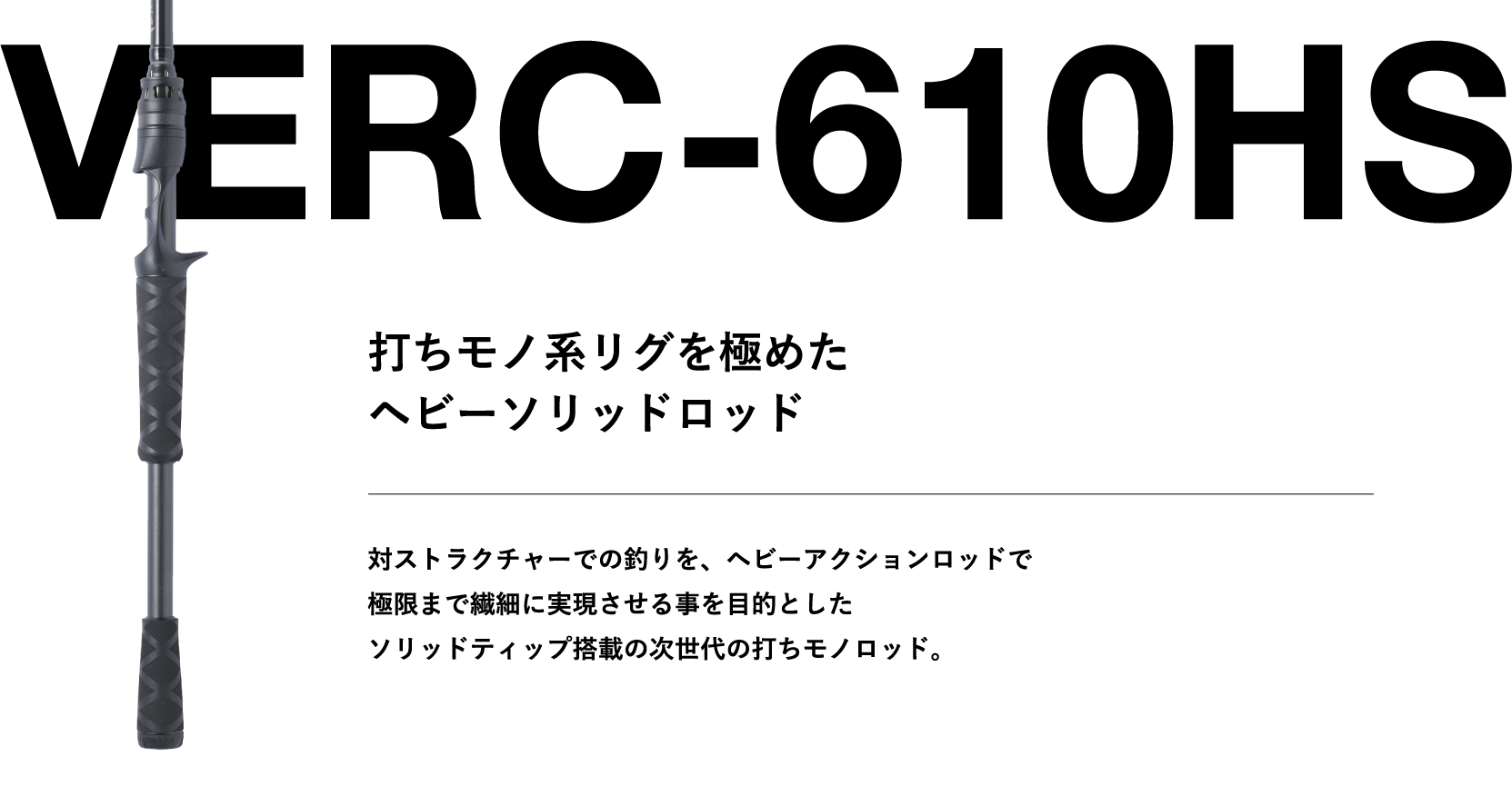 語弊を恐れず言うなら、バーサタイル性に長けているベルサートのラインナップの中で、ある種「特化型性能」を持ったモデルで、ヘビーアクション表記ながらただただ強い、ただただ固いロッドではなく、「ストラクチャーと馴染んで操作できるロッド」それがVERC-610HSです。ソリッドティップの恩恵でストラクチャーの種類やボトムのマテリアルを明確に感じ分けて繊細にルアーを操作でき、バイトがあればティップが追従する事でバスに違和感を与える事なく確実なフッキングまでの溜めを生み出す事ができ、フッキング後はTAF製法の特徴である「粘りと強さ」で多少強引なファイトであってもバスに主導権を与えず一気にランディングへといざなう事ができます。例としてウィードエリアや消波ブロックでのフリーリグやテキサスリグ、レイダウンやマンメイドでの高比重ノーシンカーなど、様々なストラクチャーと対峙するシチュエーションにおいて大きなアドバンテージをもたらします。